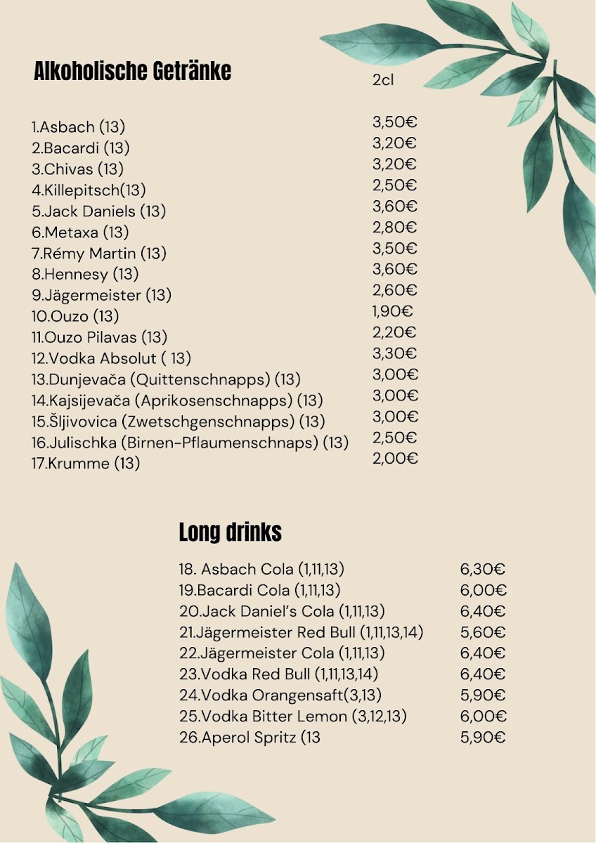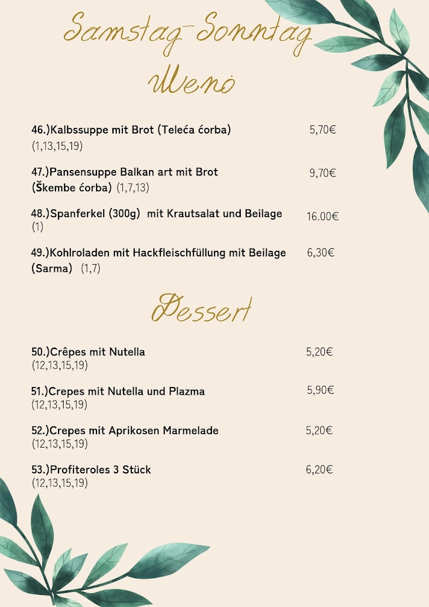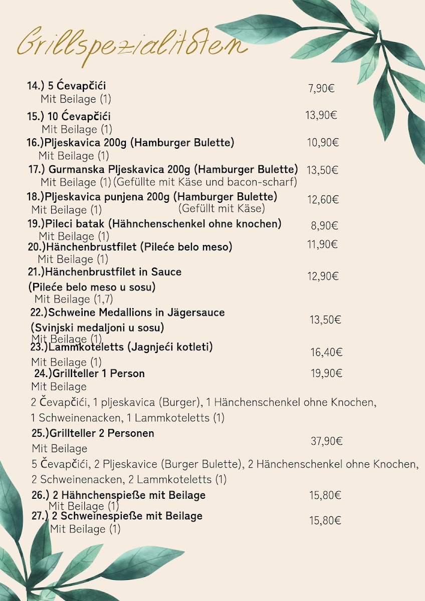 The menu features an enticing array of Vorspeisen such as the mezze mix and flavorful sausages, alongside fresh salads like the traditional Srpska and refreshing Šopska. For mains, you’ll find mouthwatering grilled specialties served in pita, including delicious cevapi and pljeskavica that truly encapsulate Balkan cuisine.